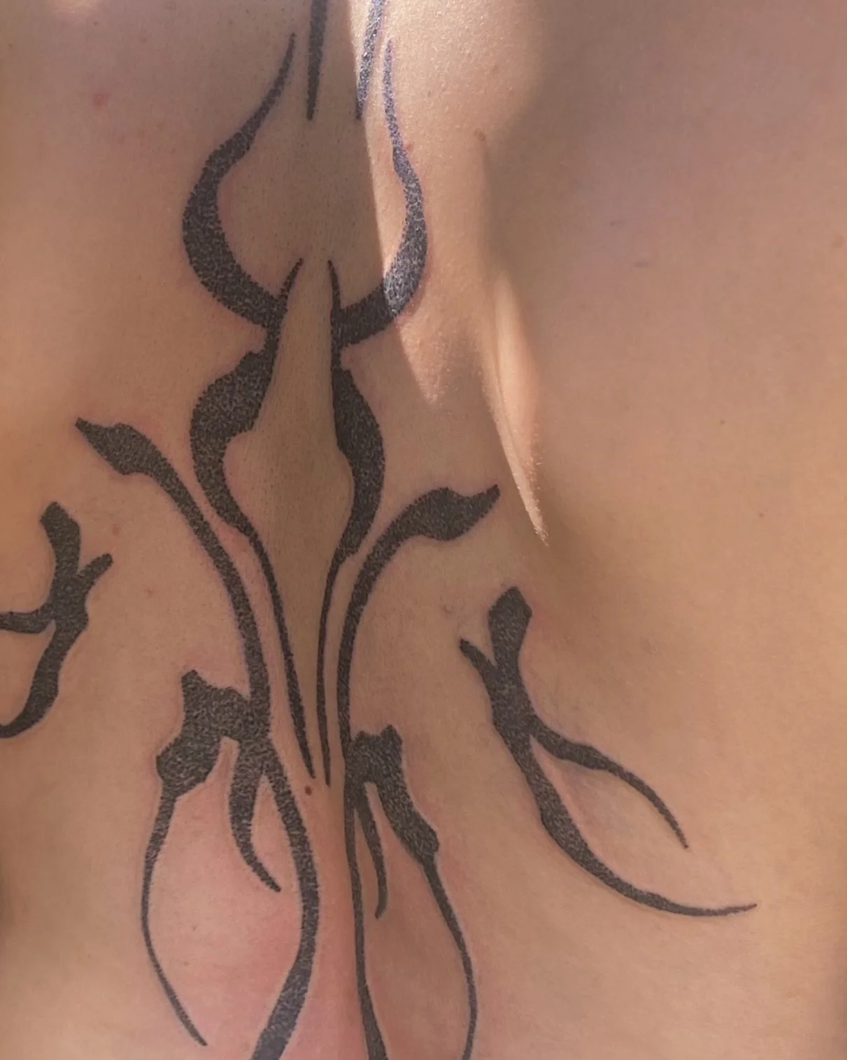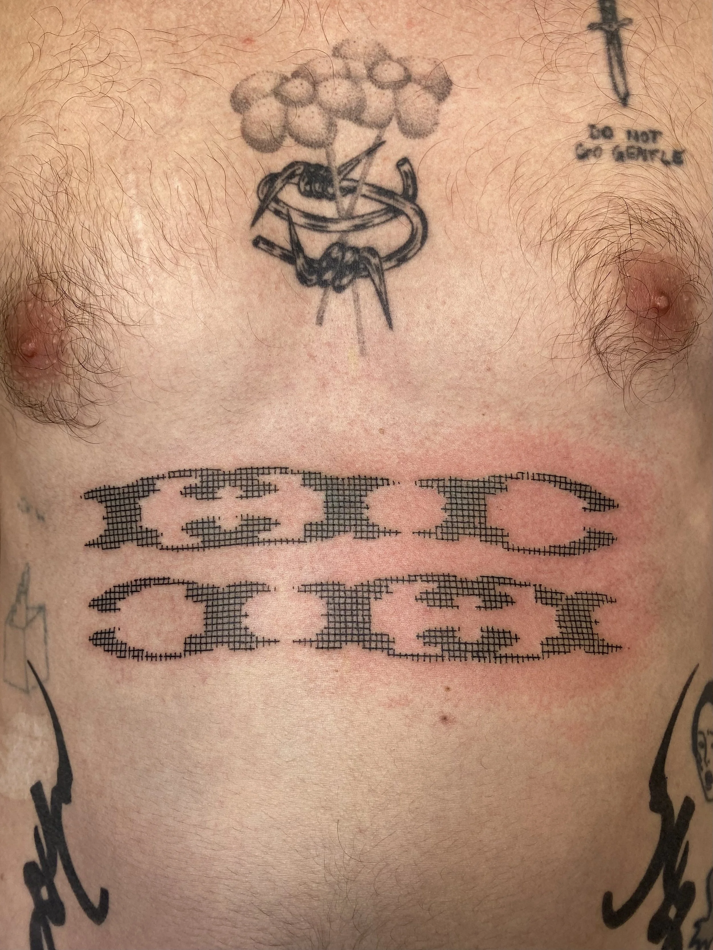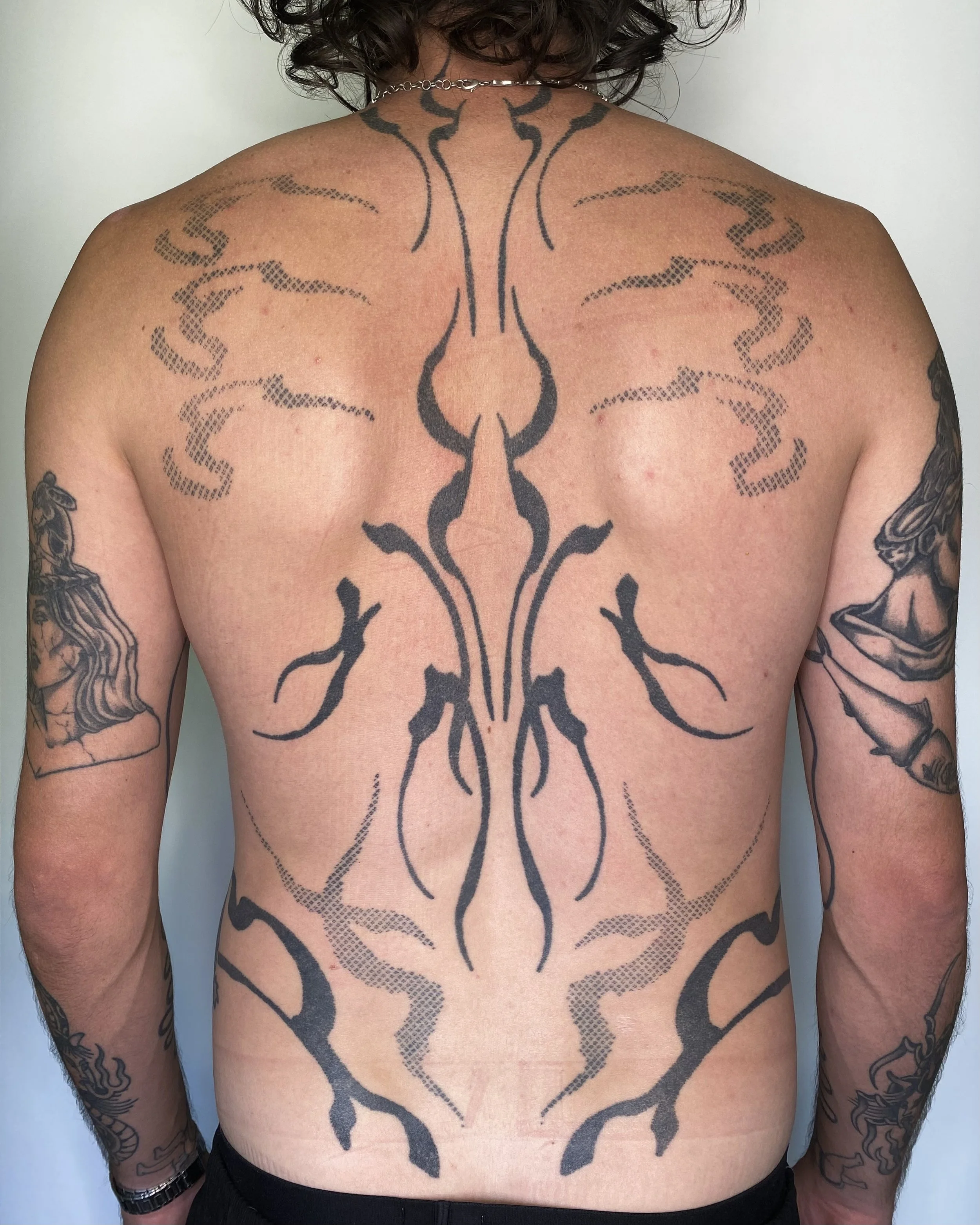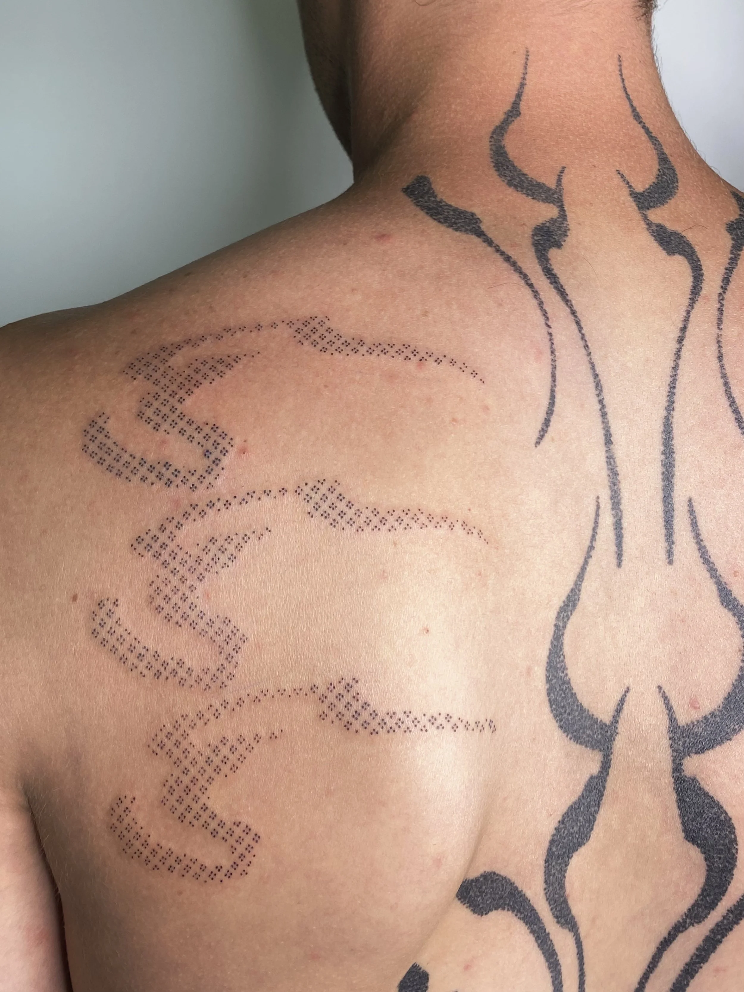 Pablo was the first person to try textured fill in the calligraphy shapes which we added pieces of as we developed his back collection. You can see in the photos those dotted shapes healed with a lot of shade variation as this was new unpracticed space for mi, so a touch up is due. We added the torso and sternum pieces some time later; the whole collection was marked over a couple of years.